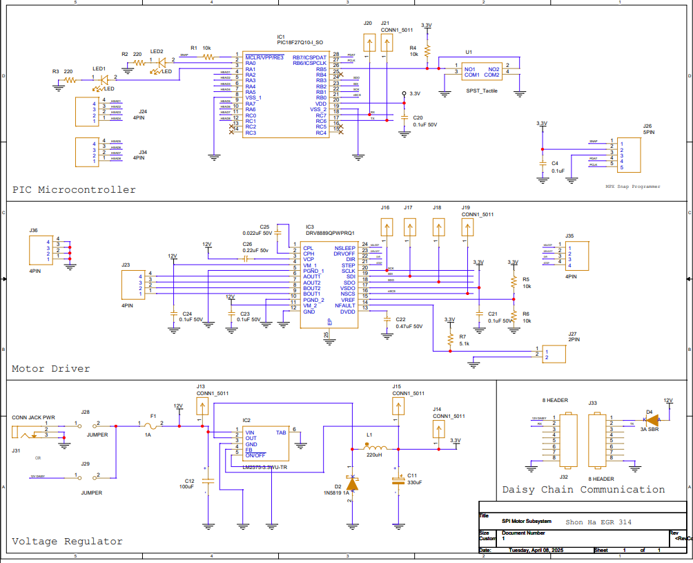 If I were capable of designing another version for my current motor subsystem, there would be many changes I would make to improve the overall design and add more functionality. It was initially intended to have two stepper motors, but the price of motor drivers was exceedingly high. One motor would offer the 360 rotation, which it currently has, but the other would add its tilt functionality to the solar panel to adjust its positioning from day to night. This would add more functionality for the solar tracker as a whole. I would also replace my motors with more expensive ones. During testing, my motor would be exceedingly hot after about five minutes of being connected to my board. This is due to how stepper motors operate, as it takes current for the motor to remain stationary. Outside of class, I would have also moved away from MPLAB and PIC microcontrollers as it proved challenging to program SPI and use the snap programmer. Another addition would be switching from SPI to PWM outside of class, as attempting to figure out SPI with the datasheet was tedious.